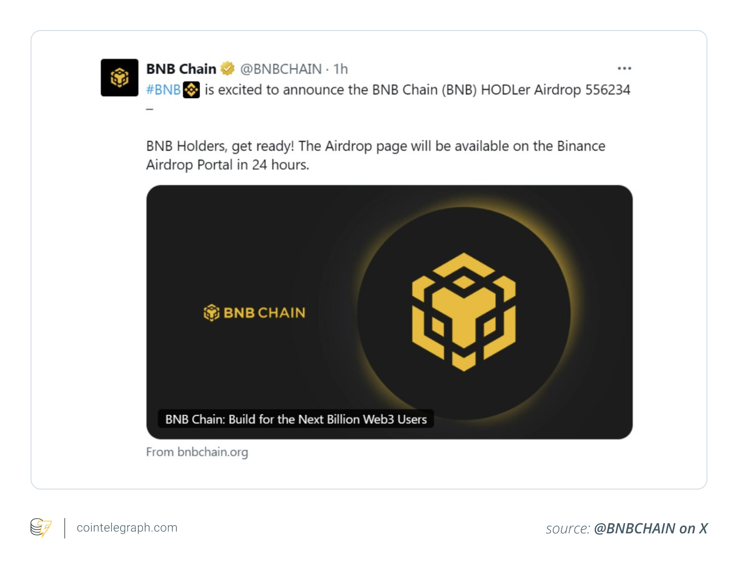 BNB Chain’in resmi X hesabı ele geçirildi ve yaklaşık 4 milyon takipçiye kimlik avı bağlantıları gönderildi. Ekip daha sonra kontrolü ele alarak uyarılarda bulundu. Kaosun ortasında saldırganın yalnızca “4.000 dolar” kazandığına dair bir şaka ortaya çıktı.